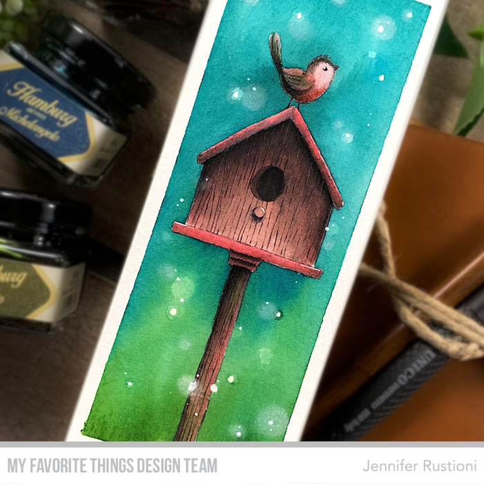 I masked the edges of the card stock with a masking tape and then stamped the birdhouse and the bird with the Distress Oxide Pumice Stone, to have a delicate effect. I masked them using a masking fluid and then colored the background using the Hamburg Inks, which are calligraphic inks but can also be used as watercolors.