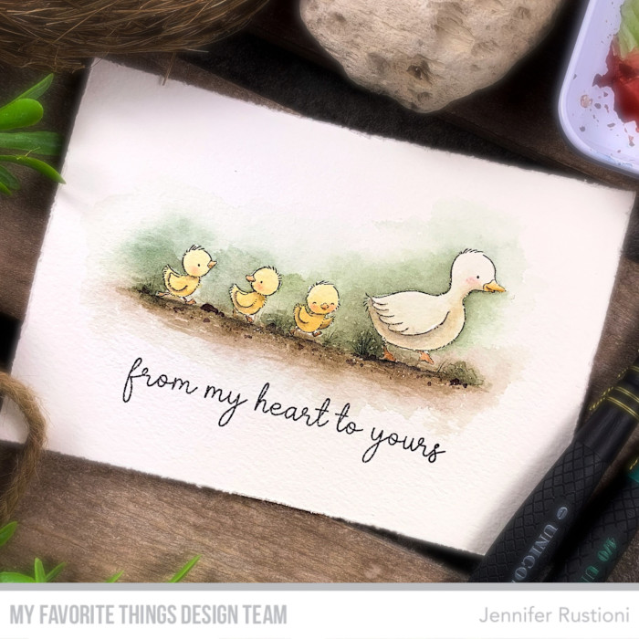 I stamped the duck and the chicken on a watercolor paper with the MFT Extreme Black Hybrid Ink Pad. I colored them and a little background using the Daniel Smith Extra Fine Watercolors.