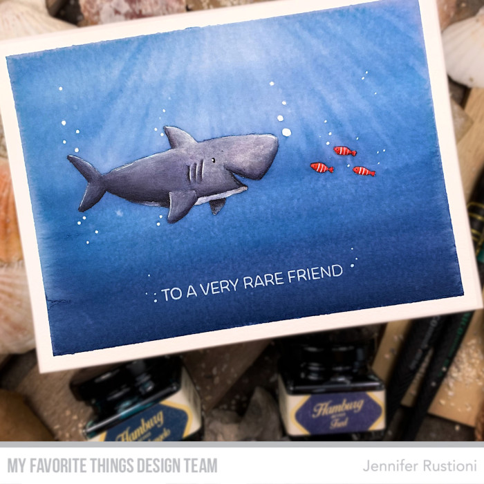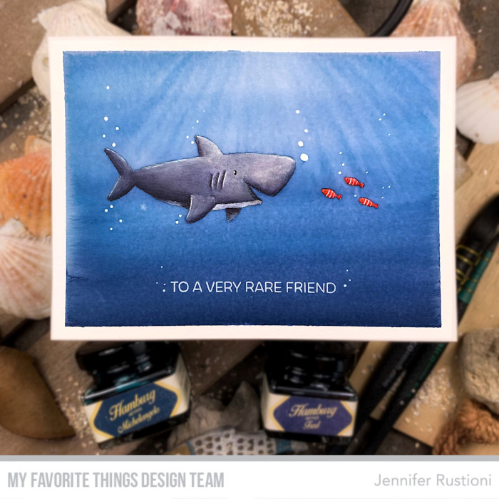 I stamped the shark and the fishes on a watercolor paper with the Distress Oxide Pumice Stone to have a no-line effect. Then, I covered them with a masking fluid.
