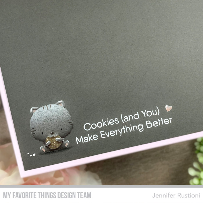 For my project I used the new super sweet MFT Chip, Chip, Hooray! Stamp Set. I stamped the kitty with the Distress Ink Picket Fence on the MFT Gravel Gray Card Stock. I colored it with the Prismacolor Premier Colored Pencils and then added the shadows with a black pastel pencil. I realized the highlights using a white gel pen and used a fineliner to create the details.