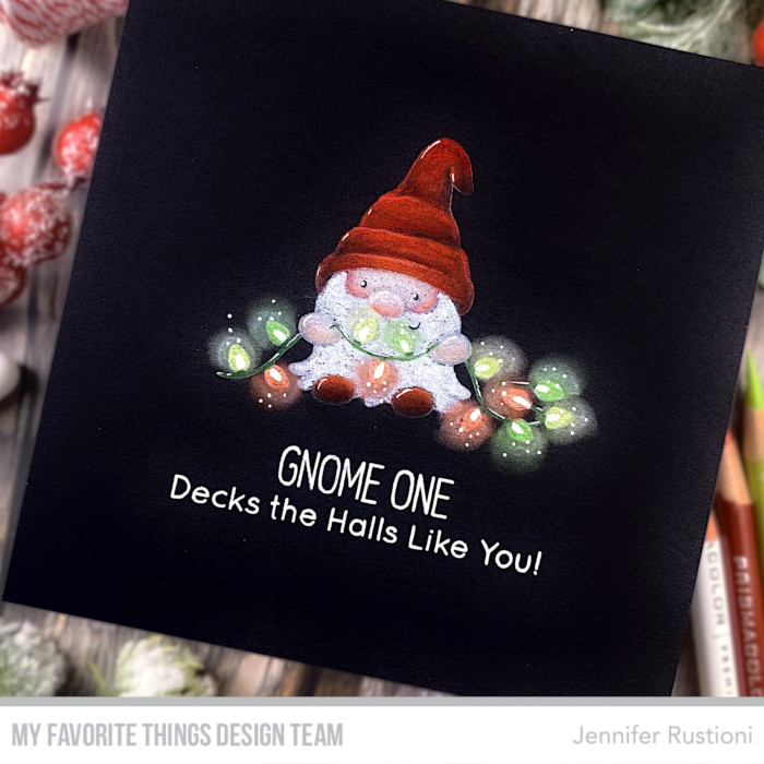 I stamped the gnome on a black card stock with the Distress Ink Picket Fence. I colored it with the Prismacolor Premier Colored Pencils. At this point I created the halos of light using pastel pencils to have a very smooth and delicate effect. Then, I colored the bulbs with colored pencils and added the highlights with a white gel pen.
