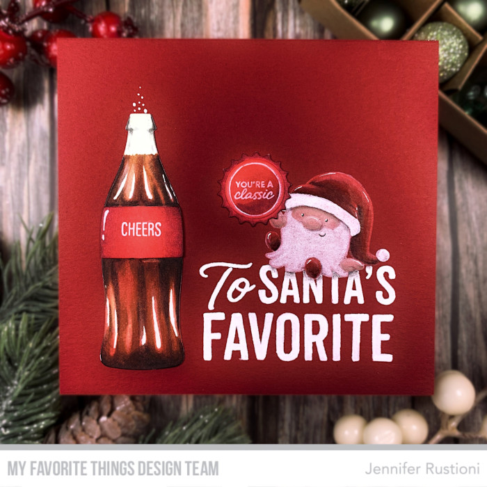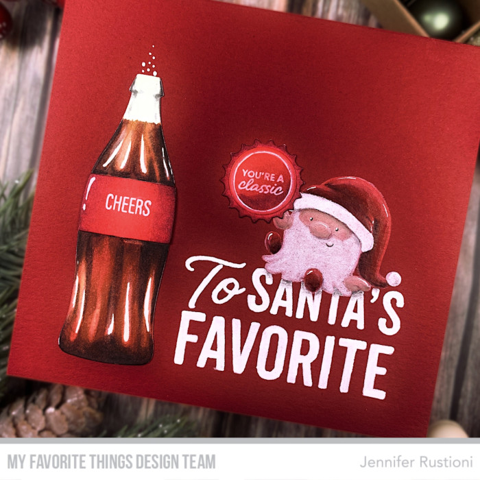 I die cut the bottle from the new MFT Soda Pop Die-namics. I colored it in the shades of Coca Cola with Copic Markers and then added the Highlights with a white gel pen. I trimmed a piece of a red card stock and stamped on it the sentiment from the MFT Christmas Cash Stamp Set and the gnome from the MFT JB Gnome For Christmas Stamp Set. I colored the gnome with Prismacolor Premier Colored Pencils and turned him into Santa.