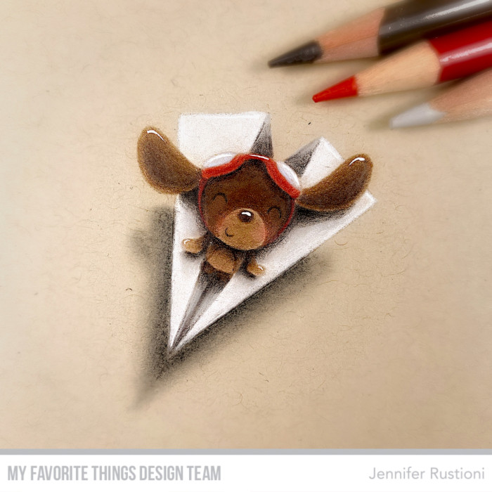 I stamped this super cute dog on the paper plan with the Versamark Ink Pad on a kraft paper to have a super no-line effect. I colored it with Prismacolor Premier Colored Pencils and then added the highlights with a white gel pen.