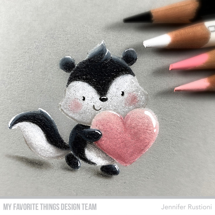 I stamped the skunk with the heart on a gray card stock with the Distress Ink Picket Fence. I colored it with the Prismacolor Premier Colored Pencils. I chose a very narrow color palette but one that I like very much: black, grey, pink and white. Then, I added the highlights with a white gel pen. At last, I realized the cast shadows with a black pastel pencil.