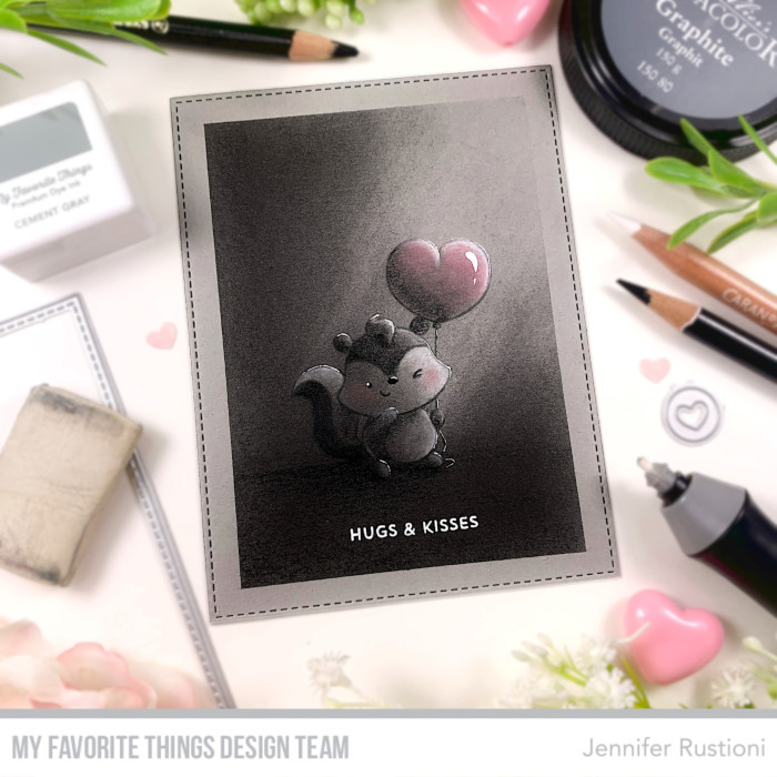 I die cut a gray card stock and then masked the edges using a masking tape. I stamped my subject using the super cute MFT JB Scent-sational Skunks Stamp Set using the MFT Cement Gray Ink Cube. At this point, I covered the whole card with graphite powder and then blended it using a cotton pad. I used a eraser to remove the graphite and create the lights. I darkened the shadows with a black pencil and added a touch of pink on the ballon and on the skunk’s cheeks with a pastel pencil.