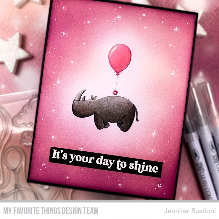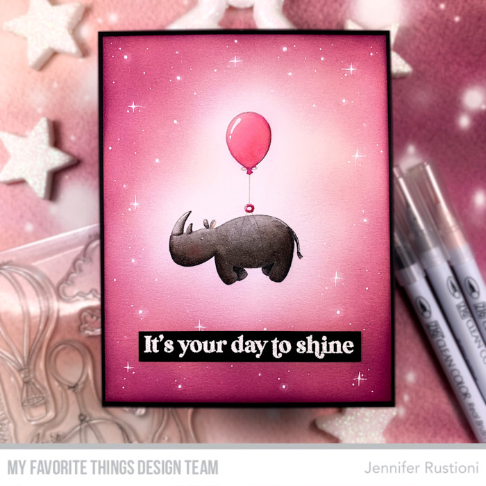 I stamped the rhino with the balloon with the Distress Oxide Pumice Stone to have a definite but delicate effect. I colored them with the Zig Clean Color Real Brush Markers and then added some highlights with a white gel pen.